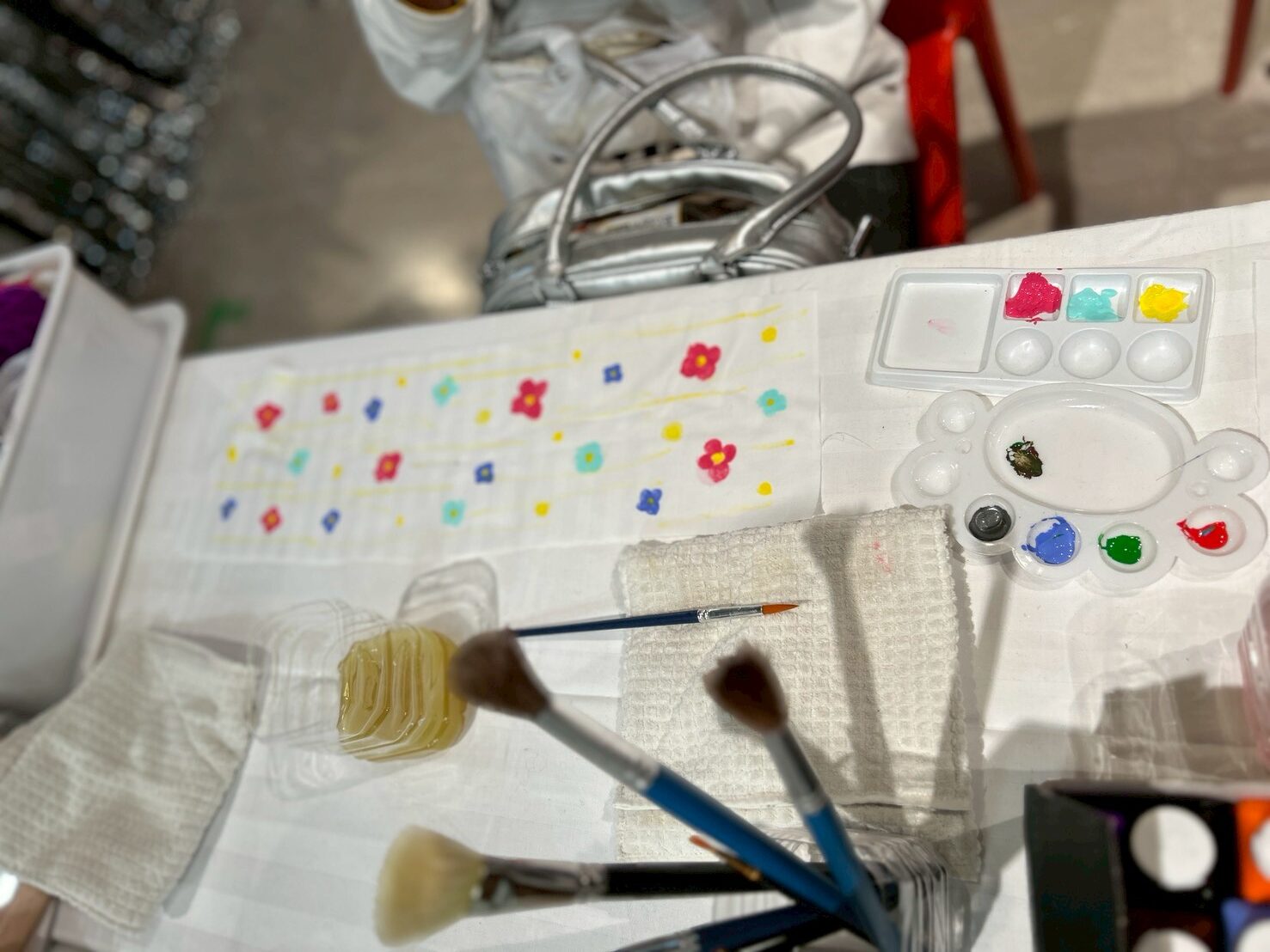 布に布用絵の具を使用し自由に絵を描いて、その場で学生スタッフが縫製してシュシュに仕上げる企画。