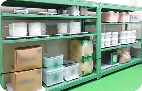 原料薬品やダンボール、ポリ容器、ポリ缶、クラフト袋などの副資材(工場)