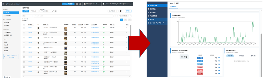 スマートマットクラウドで管理している在庫のうち、どの在庫が不動在庫に該当するのかを特定し、その在庫金額をWEB上で確認できます。これまで時間がかかっていた不動在庫の分析を簡単にし、社内の在庫削減アクション推進に貢献します。